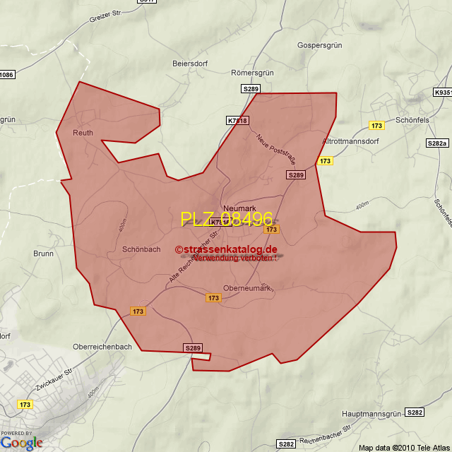 Straßenverzeichnis zur Postleitzahl 08496