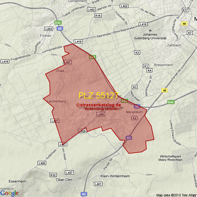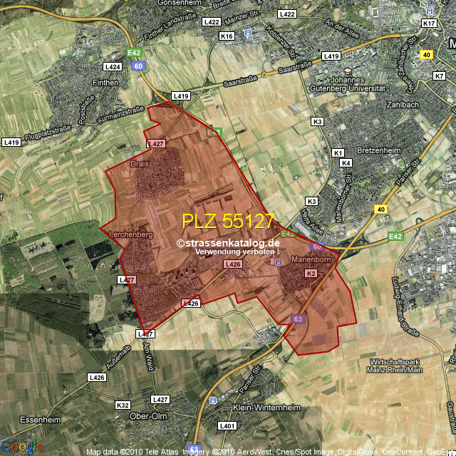 Straßenverzeichnis zur Postleitzahl 55127