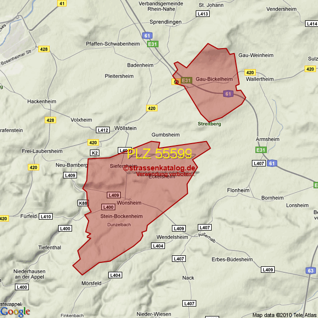Straßenverzeichnis zur Postleitzahl 55599