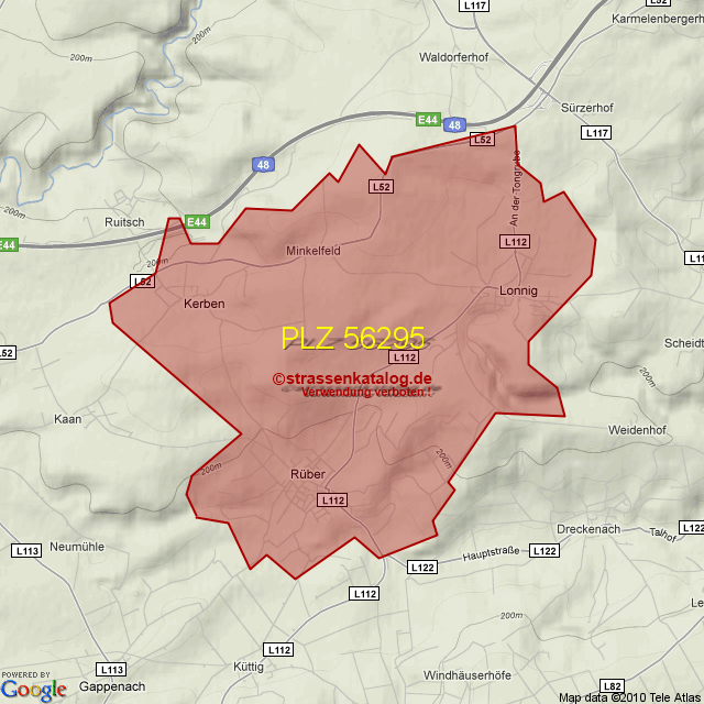 Straßenverzeichnis zur Postleitzahl 56295