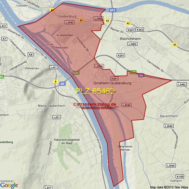 Ortsteile von Ginsheim-Gustavsburg mit der PLZ 65462