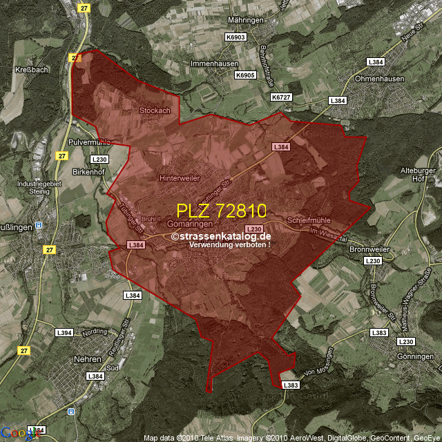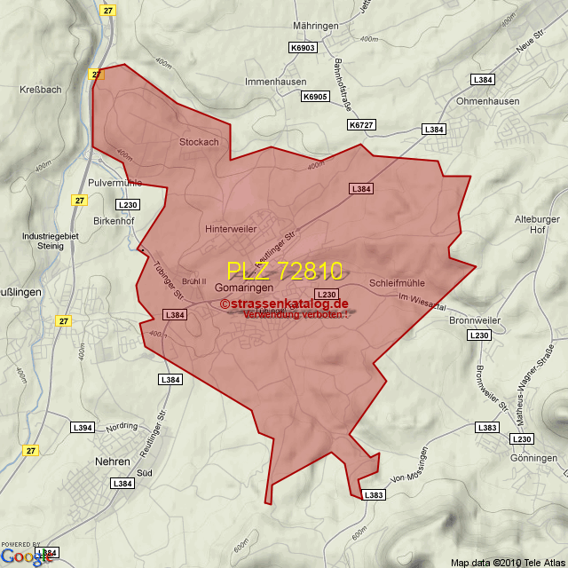 Straßenverzeichnis zur Postleitzahl 72810
