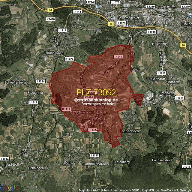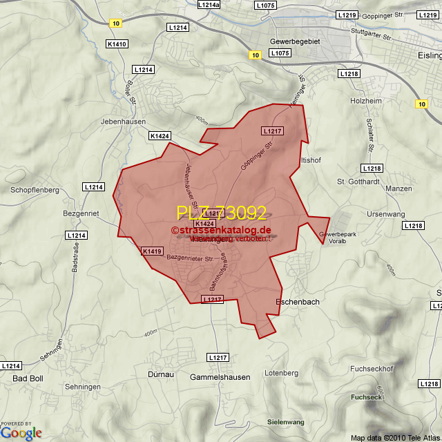 Straßenverzeichnis zur Postleitzahl 73092