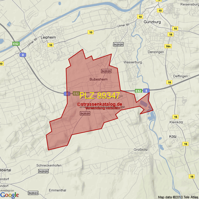 Straßenverzeichnis zur Postleitzahl 89347
