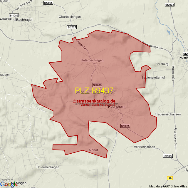 Straßenverzeichnis zur Postleitzahl 89437