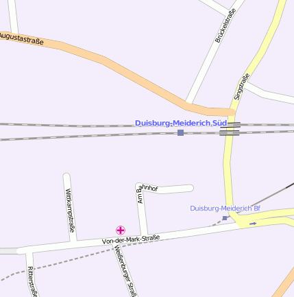 Bahnhofsanlage: Bahnhof Duisburg-Meiderich Süd (0km), Duisburg-Meiderich Süd (0.15km), Duisburg-Ruhrort Hafen (0.9km), Duisburg-Meiderich Ost (1.21km)