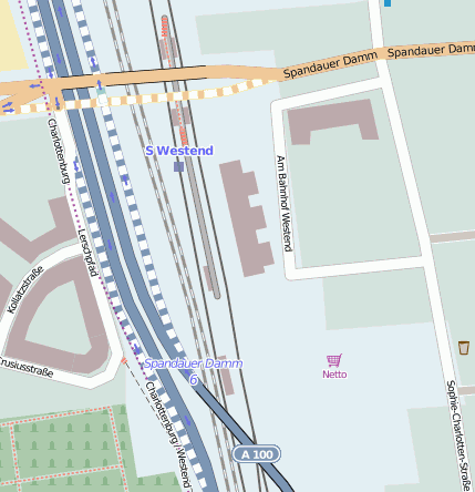 Bahnhofsanlage: Bahnhof Berlin-Charlottenburg (2.19km), Berlin-Halensee (2.57km), Bahnhof Jungfernheide (1.49km), Berlin Westkreuz (Stadtbahn) (2.07km), Berlin Westkreuz (Ringbahn) (2.07km), Berlin-Westend (0km), Bahnhof Westkreuz (1.79km), Berlin Hohenzollerndamm (3.29km), Berlin Jungfernheide (1.7km), Berlin Messe Nord/ICC (1.12km), Berlin Jungfernheide DB-Netz (1.72km), Berlin-Charlottenburg (1.8km), Berlin-Charlottenburg S-Bahn (1.86km), Berlin-Grunewald (3.66km), Berlin-Grunewald S-Bahn (3.57km), Berlin-Siemensstadt (2.77km), Berlin Heerstraße (2.02km), Berlin Wernerwerk (1.98km), Berlin Messe Süd (2.32km)