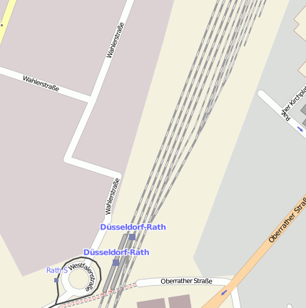 Bahnhofsanlage: Düsseldorf-Derendorf (2.64km), Düsseldorf-Derendorf Hp (2.98km), Bahnhof Düsseldorf-Derendorf (2.81km), Düsseldorf Zoo (3.57km), Düsseldorf-Rath (0km), Bahnhof Düsseldorf-Rath (0.04km), Düsseldorf-Rath Mitte (1.14km)
