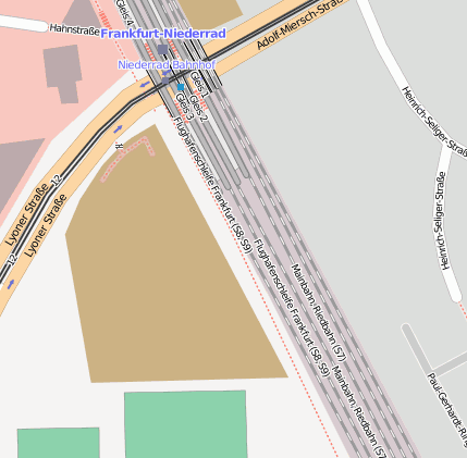 Bahnhofsanlage: Neu-Isenburg (3.57km), Frankfurt (Main) Hbf (tief) (3.36km), Frankfurt (Main) Hbf (3.32km), Frankfurt (Main) Galluswarte (2.78km), Frankfurt-Niederrad (0km), Bahnhof Frankfurt-Niederrad (0.08km), Frankfurt am Main Stadion (1.3km), Bahnhof Frankfurt-Sportfeld (1.38km), Bahnhof Neu Isenburg (3.69km)