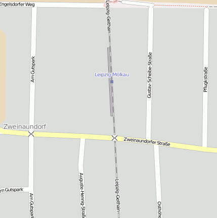Bahnhofsanlage: Leipzig-Schönefeld (3.46km), Leipzig-Paunsdorf (2.41km), Bahnhof Leipzig-Paunsdorf (2.86km), Engelsdorf Werkstätten (1.75km), Leipzig-Mölkau (0km), Leipzig-Holzhausen (2.16km), Engelsdorf (b Leipzig) (2.16km), Engelsdorf Hp (2.42km)