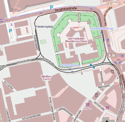 Gebäude: Synagoge und Gemeindezentrum Darmstadt (0.65km), Stadtkirche Darmstadt (0.19km), Försterei Böllenfalltor (2.71km), Regierungspräsidium Darmstadt (0.26km), Residenzschloss (0km), Hessisches Landesmuseum Darmstadt (0.3km)