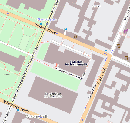 Gebäude: Deutsches Museum München (2.18km), Regierung von Oberbayern (1.41km), Deutsches Theatermuseum München (0.7km), Staatliches Museum Ägyptischer Kunst, Staatliche Münzsammlung München (0.92km), Staatliches Museum für Völkerkunde München (1.55km), Residenz (0.92km), Klinikum München Schwabing (2.83km), Archäologische Staatssammlung München, Museum für Vor- und Frühgeschichte (1.47km), Sankt Peter (1.31km), Bayerisches Nationalmuseum München (1.47km), Sankt Cajetan (Theatinerkirche) (0.76km), Dom zu Unserer Lieben Frau (Frauenkirche) (1.05km), Staatliche Naturwissenschaftlichen Sammlungen Bayerns: Museum Reich der Kristall (0km), Alte Pinakothek München (0.23km), Pinakothek der Moderne München (0.14km), Deutsches Herzzentrum München (1.88km), Klinikum Rechts der Isar der Technischen Universität München (2.37km), Bayerische Landtag (2.07km), Klinikum der Universität München, Campus Innenstadt (2.1km), Staatliche Naturwissenschaftlichen Sammlungen Bayerns: Paläontologisches Museum (0.68km), Staatliche Antikensammlungen und Glyptothek München (0.72km), Staatliche Naturwissenschaftlichen Sammlungen Bayerns: Geologisches Museum Münch (0.62km), Museum für Abgüsse Klassischer Bildwerke München (0.64km), Schack-Galerie München, Bayerische Staatsgemäldesammlungen (1.6km), Sankt Johannes Nepomuk (Asamkirche) (1.47km), Sankt Michael (1.04km), Neue Pinakothek München (0.25km), Hauptsynagoge Ohel Jakob München (1.51km)
