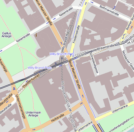 Bahnhofsanlage: Bahnhof Frankfurt-Süd (1.34km), Frankfurt (Main) Hbf (1.04km), Frankfurt (Main) Hbf (tief) (1.09km), Frankfurt (Main) Lokalbahnhof (1.46km), Bahnhof Frankfurt-Louisa (2.86km), Eiserner Steg (0.5km), Frankfurt (Main) Süd (1.36km), Frankfurt (Main) Ostendstraße (1.67km), Frankfurt (Main) Taunusanlage (0.7km), Frankfurt (Main) Hauptwache (0.65km), Frankfurt (Main) Stresemannallee (1.63km), Frankfurt (Main) Konstablerwache (1.1km), Frankfurt-Louisa (2.83km)