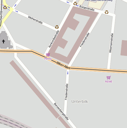 Geografische Punkte und Wege aus OpenStreetmap in der Nähe von ``Bilker Allee´´
